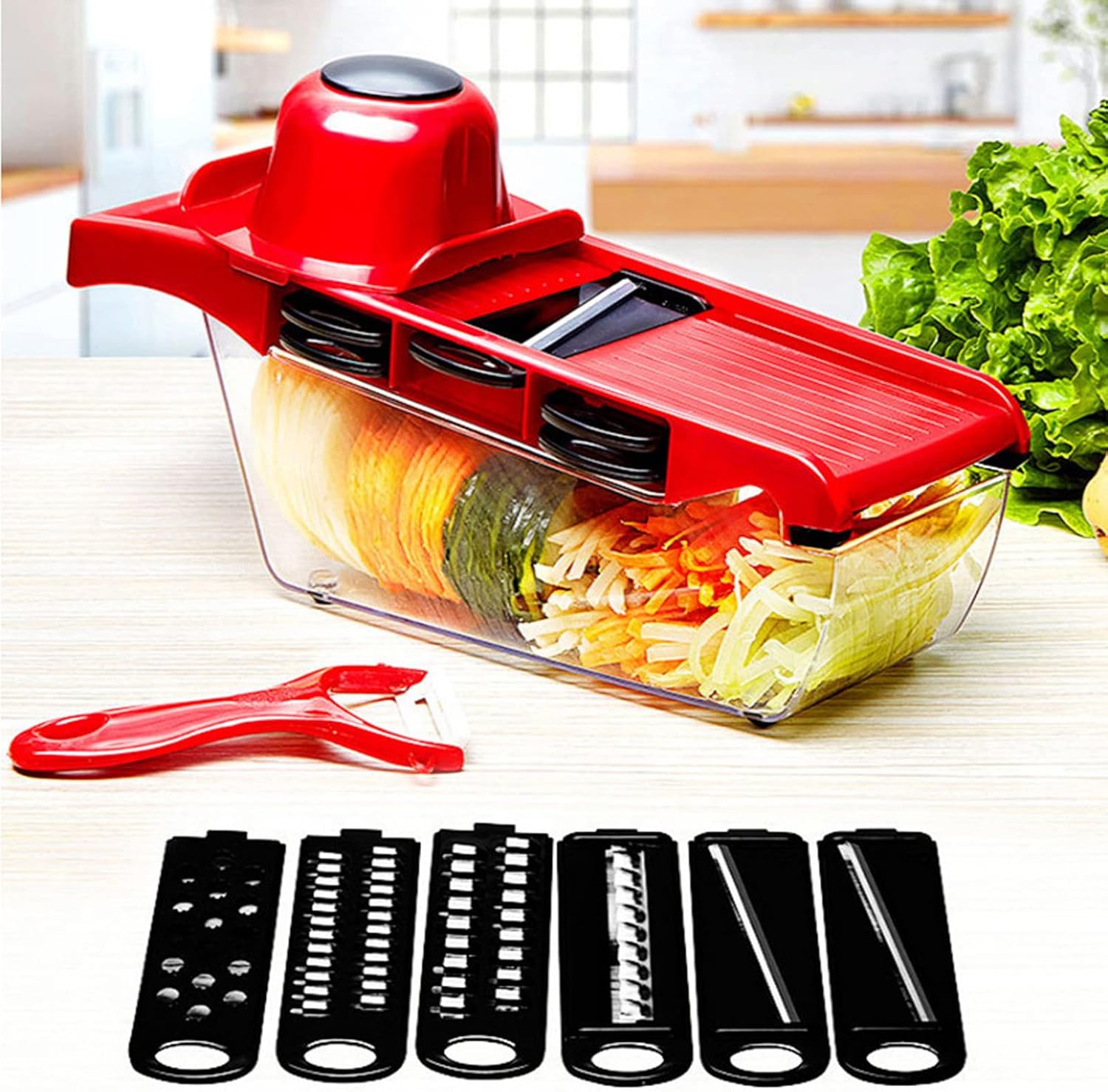 Versatile Cutting Options: Slice through a variety of vegetables effortlessly with our vegetable slicer, equipped with five sharp stainless steel blades. From onions to carrots, this slicer handles all your slicing needs with precision and ease.